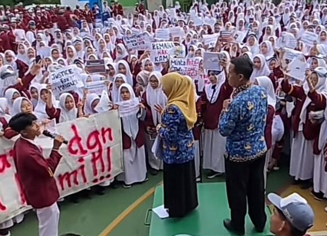 Sebanyak 850 pelajar Madrasah Aliyah Negeri di Kota Bekasi menggelar aksi damai di tengah apel upacara di halaman sekolah pada Senin (17/2/2025). Seorang pelajar berinisial J mengungkapkan, ratusan pelajar terpaksa berunjuk rasa karena kecewa dengan kepemimpinan kepala sekolah mereka. Salah satu kebijakan yang membuat pelajar kecewa karena kepala sekolah diduga tak pernah memberi upah bulanan kepada pembina ekstrakurikuler.